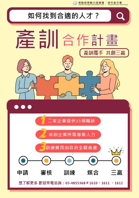 - 結訓僱用:受訓期間由勞動力發展署桃竹苗分署對學員進行考核,訓後成績符合標準者,由合作企業予以僱用。