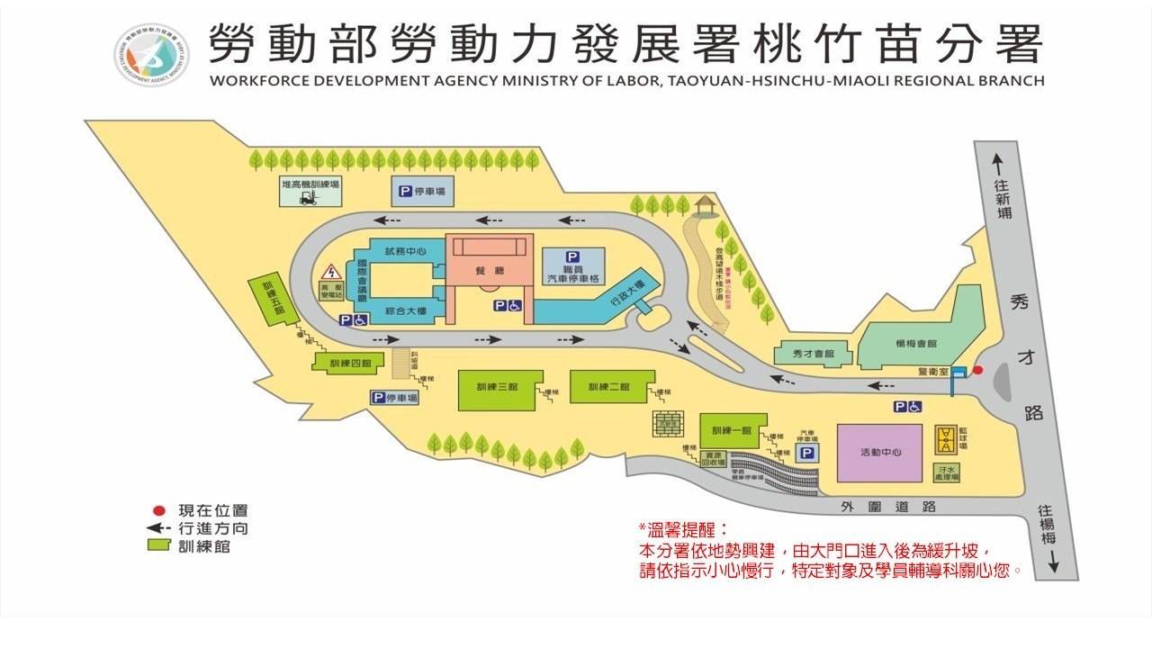 本分署依地勢興建,由大門口進入後為緩升坡,請依指示小心慢行。